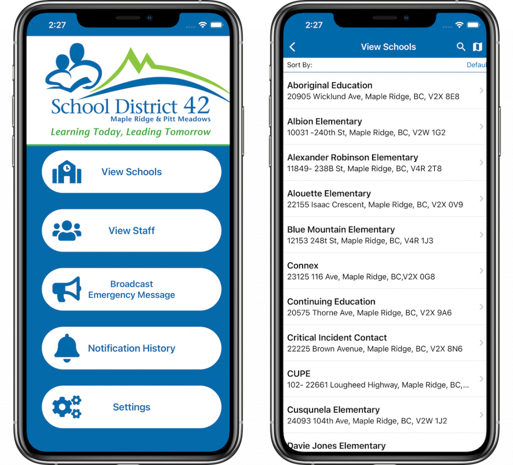 School District 42 (SD42) is a school district in British Columbia serving the municipalities of Maple Ridge and Pitt Meadows. In 2012, SD42 commissioned the building of a custom mobile application Emergency Call List (ECL) dedicated to the district staff. The app allows the staff such as principals, teachers, administrators, at each school in the district instant access to important information as well as their representative supervisors in case of an emergency such as a school lock down, a fire, or an earthquake.