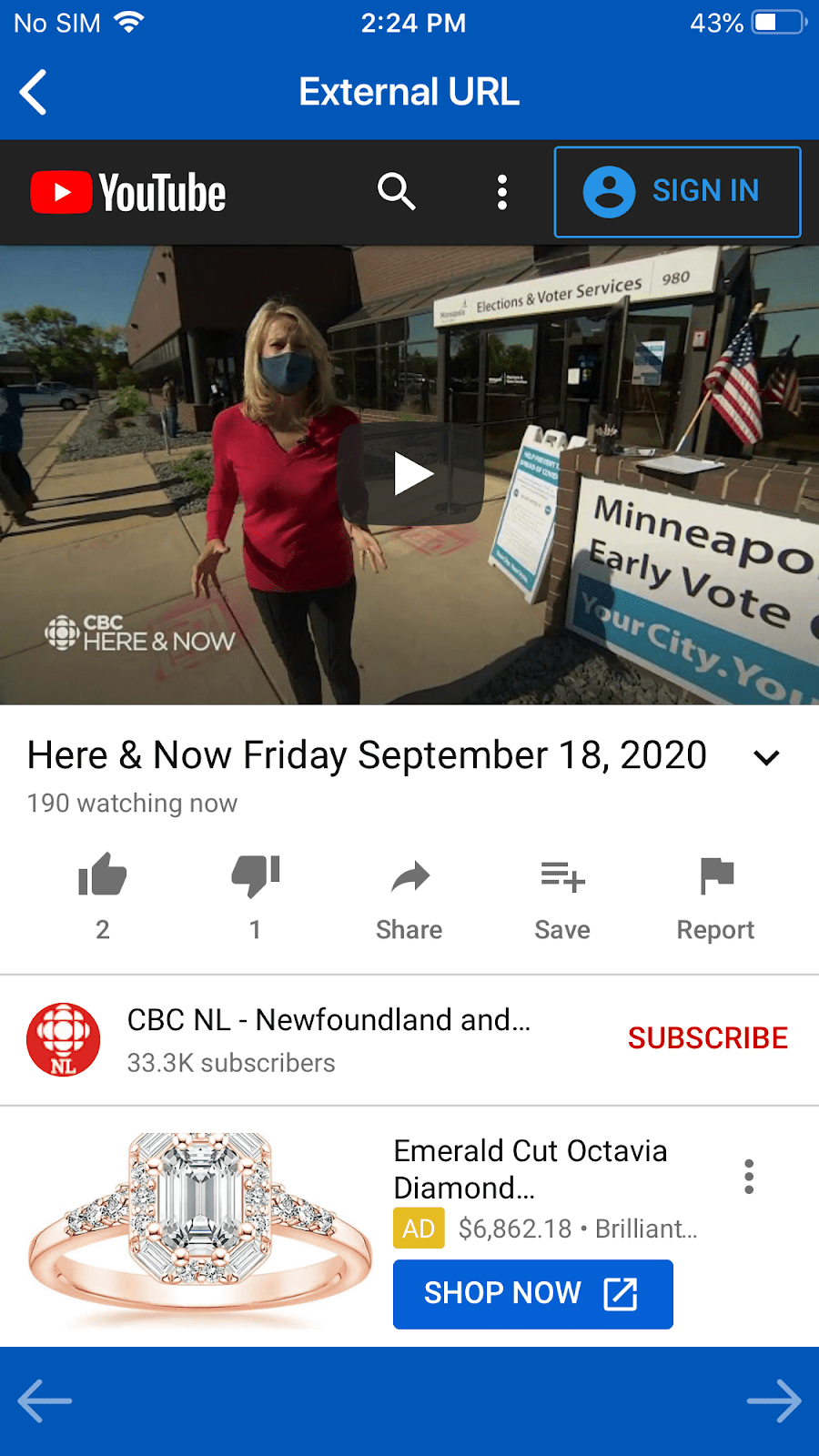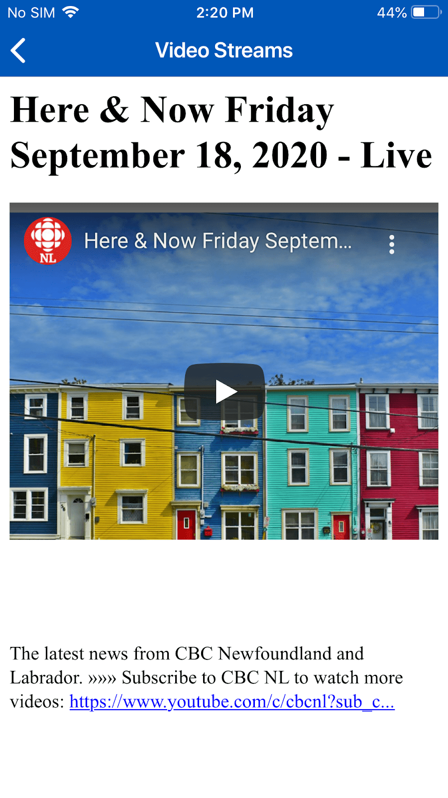 Another idea tested to bring in live videos was embedding a video using the HTML Page module. Although not as straightforward as the external URL, using the HTML Page module to embed videos is a great way to make it feel native to the users. Platforms that allow you to embed videos, like Vimeo, Youtube, or Facebook, for example, will provide the iFrame code. The HTML Page module supports HTML code input (thus the name) and as such was an ideal way to embed live videos or even scheduled videos that will be live in the future. In addition, the module accepts HTML text formats, allowing you to add additional information such as a description or hyperlinks if desired. The first image below shows a stream embedded using the HTML page module using Info Grove’s Content Management System (CMS), while the second image shows what that content looks like in the app.